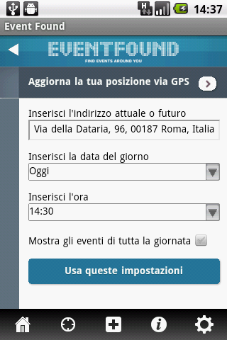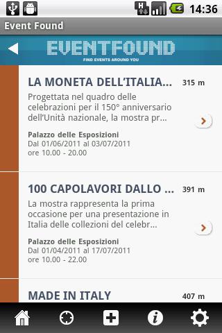 The application picks out all events around you ordered by distance from your position registered by your GPS device. It is possible to select the category of the event and also set an address, a day and a time different from the current in order to schedule your day within the space of a month.