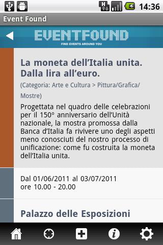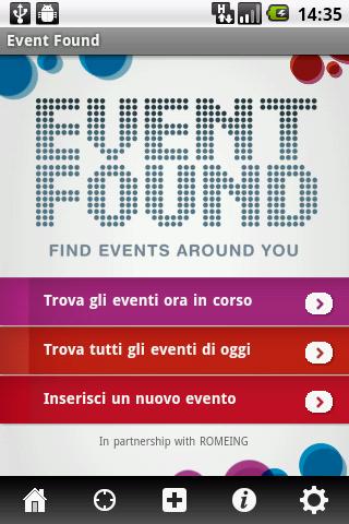 Event Found is the first events social network optimized for mobile devices. For now only the events within the area of Rome (Italy) and its province are available as posted and managed by the press office of the magazine in English Romeing (www.romeing.it). Soon events from other cities will be included in the application also thanks to the user’s help.