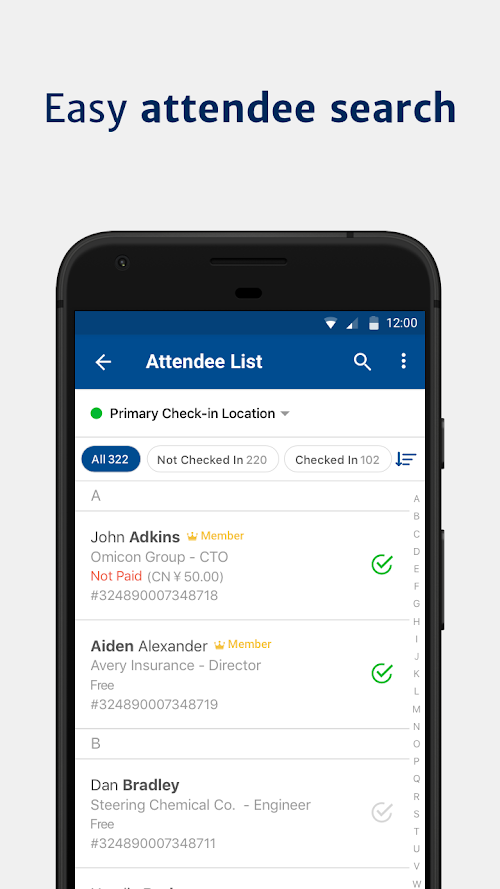 * Check in attendees quickly, update event details, and keep all data synchronized with the cloud platform