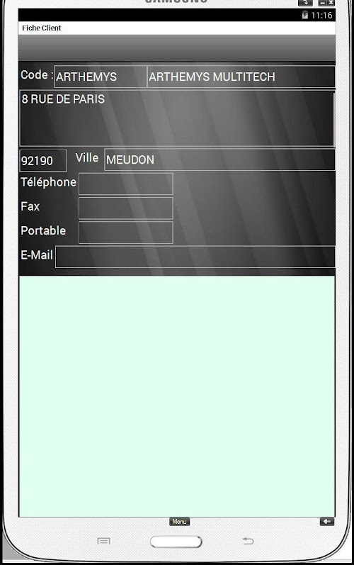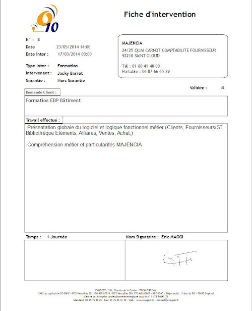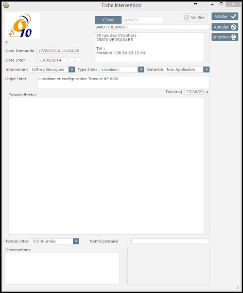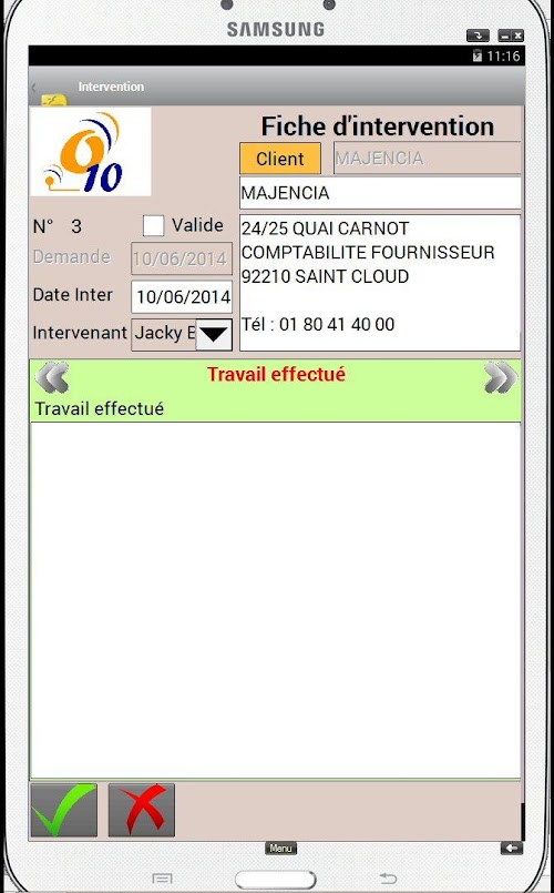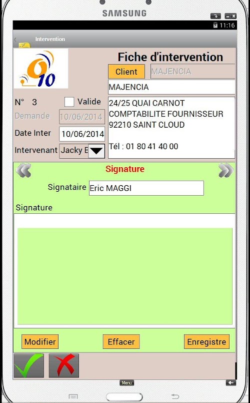 The Android app allows you to process the technician assigned Interventions: Intervention Report Time spent Observations client, name of the signatory, Taking pictures, digital signature. Once the card validated intervention, a report can be automatically sent on e-mail client as well as an e-mail address of the company. During the next synchronization, the interventions will be remounted on PC society, and new interventions recovered on the tablet.