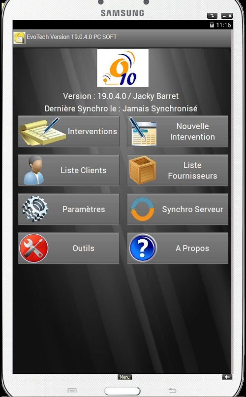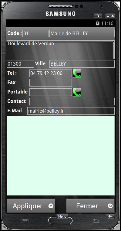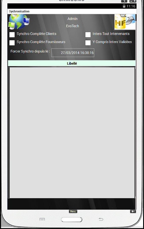 L’application Android permet de traiter les Interventions affectées au technicien : Rapport d’intervention, Temps passé, Observations client, Nom du signataire, Prise de photo, Signature numérique. Une fois la fiche d’intervention validée, un rapport peut être envoyé automatiquement sur e-mail du client ainsi que sur une adresse e-mail de la société. Lors de la prochaine synchronisation, les interventions réalisées seront remontés sur PC de la société, et les nouvelles interventions récupérées sur la tablette.