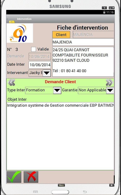 The Android app allows you to process the technician assigned Interventions: Intervention Report Time spent Observations client, name of the signatory, Taking pictures, digital signature. Once the card validated intervention, a report can be automatically sent on e-mail client as well as an e-mail address of the company. During the next synchronization, the interventions will be remounted on PC society, and new interventions recovered on the tablet.