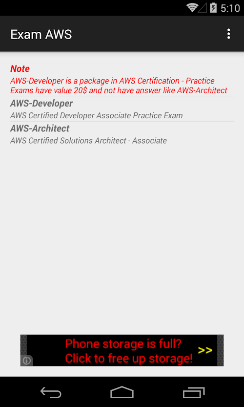 If you are looking to download other versions of Exam AWS Android App, We have 1 version in our database. Please select one of them below to download.