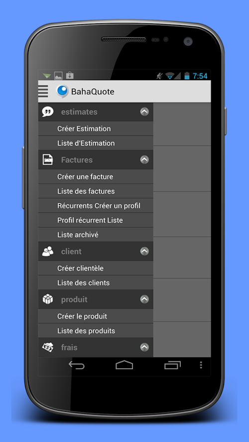 • fonctionnalité de rapport avec facture, paiements reçus et rapport de dépenses.Invoice and Billing Excluding mobile application is now available without the need to have an Internet connection to run this proposal and free invoice software. The best part is that offline billing now comes with a new mobile data synchronization functionality for web and vice versa.