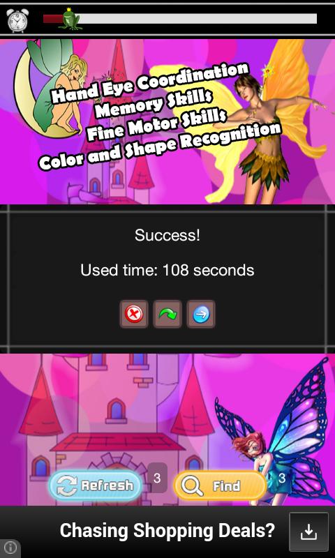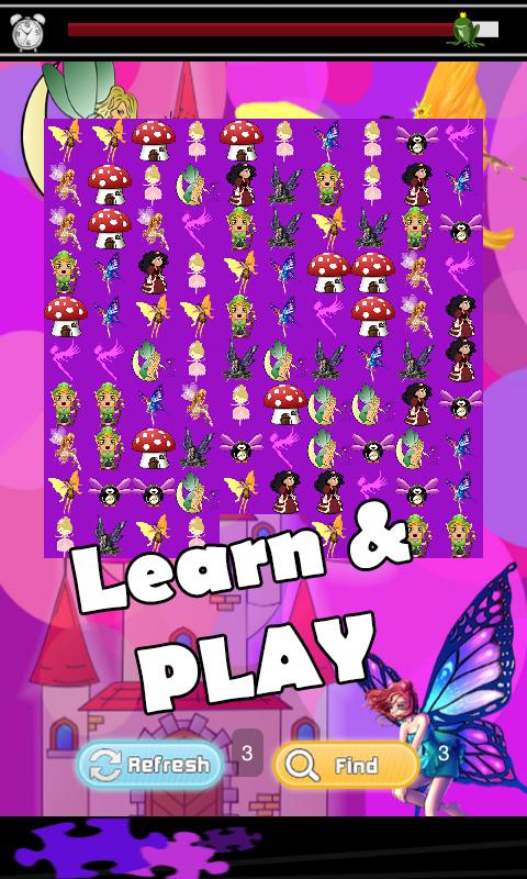 If you get stuck while playing the fairy matching games, there is some help available for you along the way. Tap on the Refresh button, and the playing cards will be shuffled, so that you can find some more matches. The other option in these fairies games for free is to hit the Find button. This will find 3 free links for you, which can be very useful as the game progresses, and your time runs out! All this while listing to an awesome happy tinkling sound!