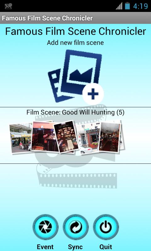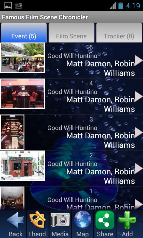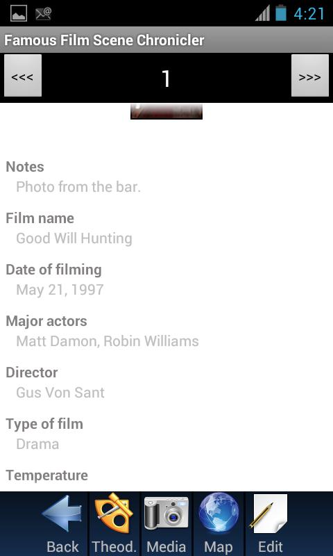 The Famous Film Scene Chronicler is a MajorForms android application that allows you to document any famous film scene incorporating images, video, audio recordings, and/or text. For example, you may be in Chicago IL, and want to document the Dark Knight scene at the Atwood Cafe. You can use our application to document the location with longitude, latitude, altitude and a time stamp of when you were there. The application also allows you to track (with GPS) all or parts of your trip to these scenes and enables the data to be synchronized to a free website created by you to store, edit, and/or share your information with others. You can also allow friends to view the places you have seen during or after your trip by sharing it through your website, Facebook or Google+, Twitter, Linkedin, e-mail, etc. Once the film scene is uploaded to your website, you can edit the data, create reports and/or maps, and download the data or reports to spreadsheets or other documents. You do not need to have access to the internet to run the application, but if you do, you can upload your data and preserve it. Give it a try, it is free. Once your data collectng is completed, you can automatically create a video of the sites you have visited.