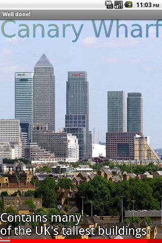 Big Ben, Houses of Parliament, Buckingham Palace, St. Paul's Cathedral, Harrods. London is full of historic buildings, marvellous architecture and eye-catching landmarks. This entertaining and educational game uses 174 inspiring photos to teach you to recognise 58 of the most famous. Enjoy the photos and original music, listen to the names, and choose the correct images.