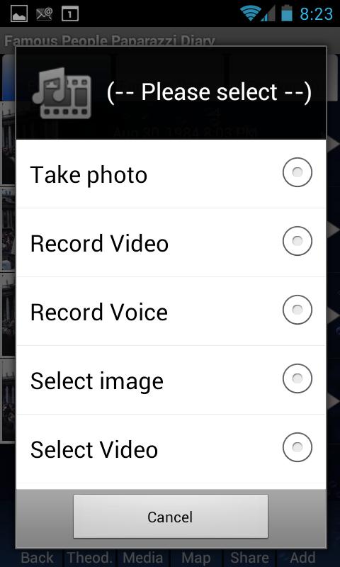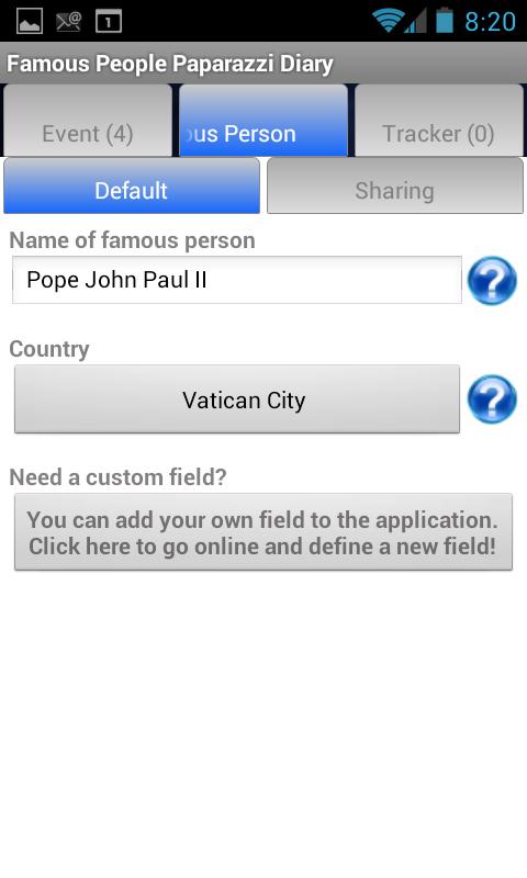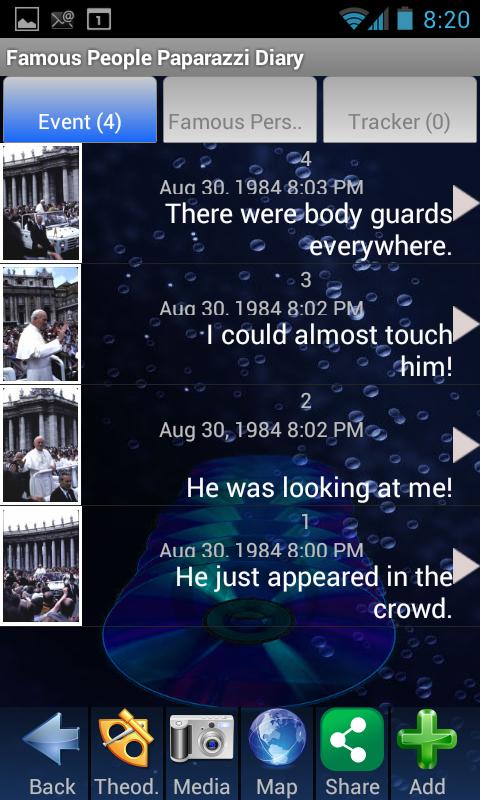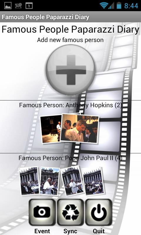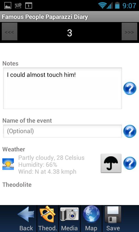 The Famous People Paparazzi Diary is a MajorForms android application that allows you to document any famous people you encounter incorporating images, video, audio recordings, and/or text. For example, you may run into Brad Pitt at the opening premier of one of his movies. You can use the application to document the location with longitude, latitude, altitude and a time stamp. You can allow friends or family to view the famous people you have seen by sharing it through your website, Facebook or Google+, Twitter, Linkedin, e-mail, etc. Once the famous person is uploaded to your website, you can edit the data, create reports and/or maps, and download the data or reports to spreadsheets or other documents (and add additional photographs or video from other cameras. You do not need to have access to the internet to run the application, but if you do, you can upload your data and preserve it. The application now automatically documents the weather for each event.