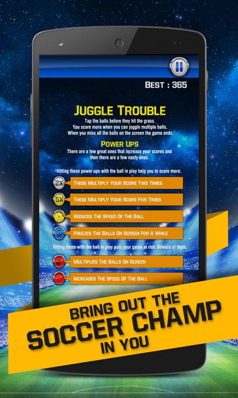 Game Play: Tap the balls before they hit the grass. First 10 successful taps will bring in 1 more ball on the screen and the speed will increase.