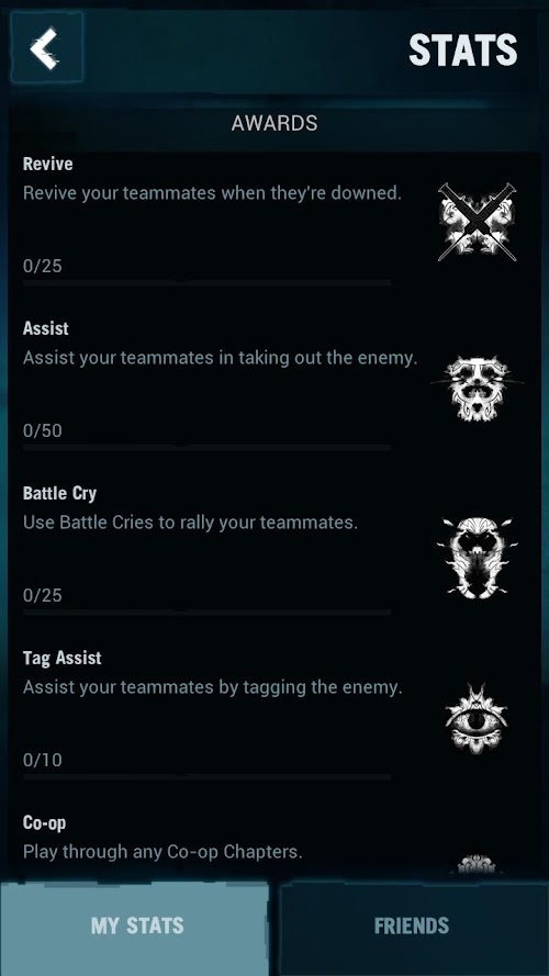 - Check out your personal stats and the stats of your friends, including time played, level, top weapons, awards and more.
