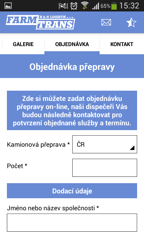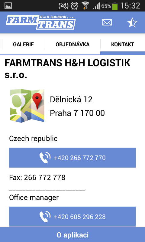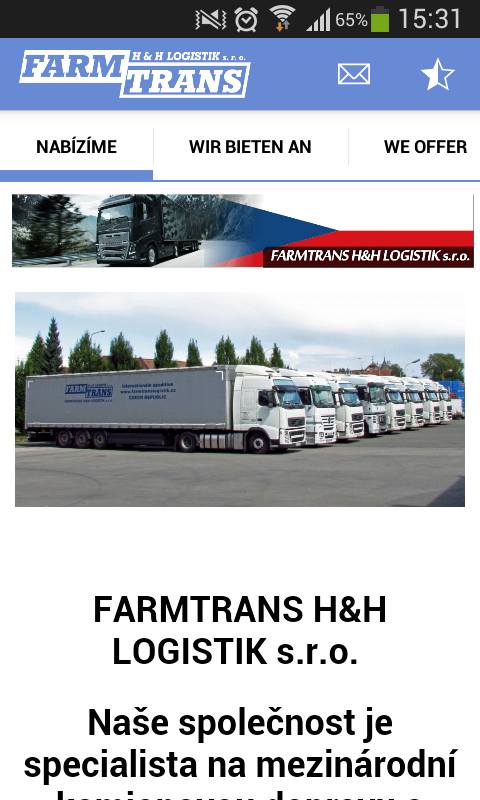 Mobilní aplikace FARMTRANS H&H LOGISTIK s.r.o. Vám přináší kompletní informace o nás a našich službách. Jsme specialisté na mezinárodní kamionovou dopravu a zasilatelství. Mobile applications FARMTRANS H & H LOGISTIK Ltd. Brings you complete information about us and our services. We are specialists in international road haulage and freight forwarding.