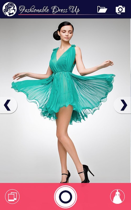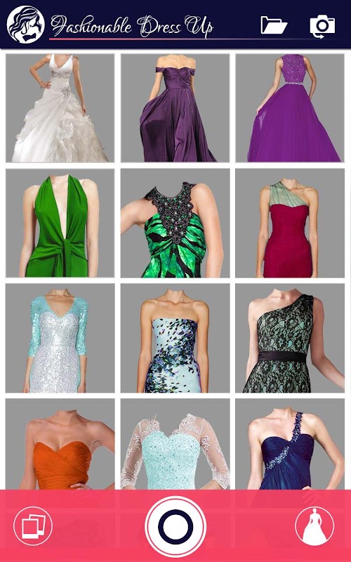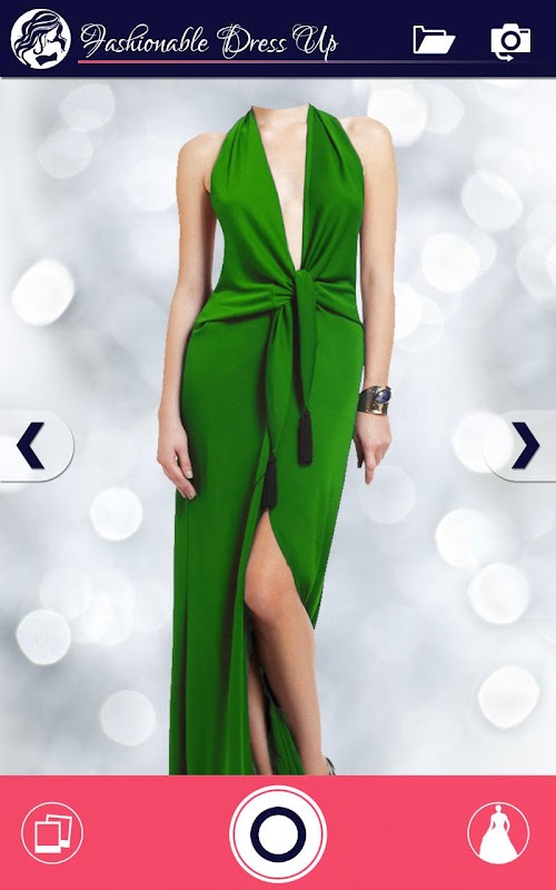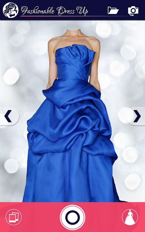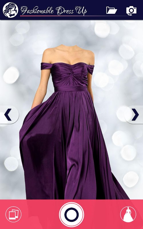 Just click a new photo from the Fashion Dress Up app or choose one from your gallery and adjust one of these glamorous dresses over the photo to see a new you!
