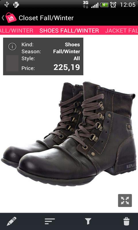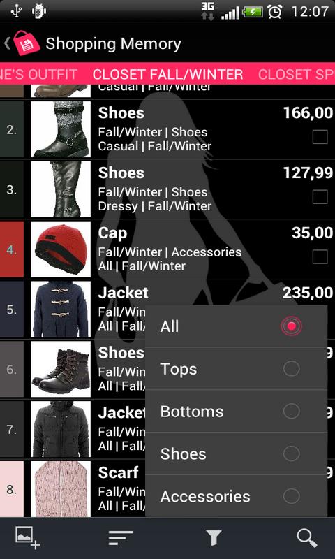 - Combine clothing entered by tops, bottoms, shoes, accessories and create a new shopping lists.