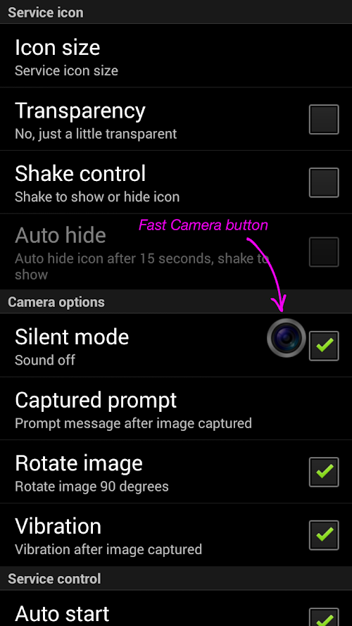 5. Fast Camera has some custom options; you can change appearance of the camera button icon, such as size, auto hide and transparency.