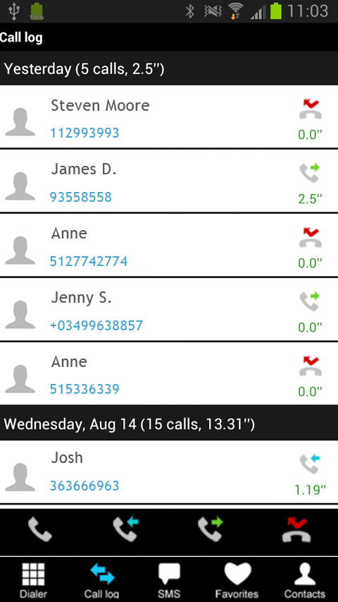 * Detailed Call log with filters for missed, dialed, received calls as well as call period (last 7 days, previous week, this month)