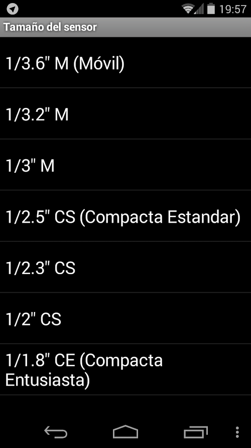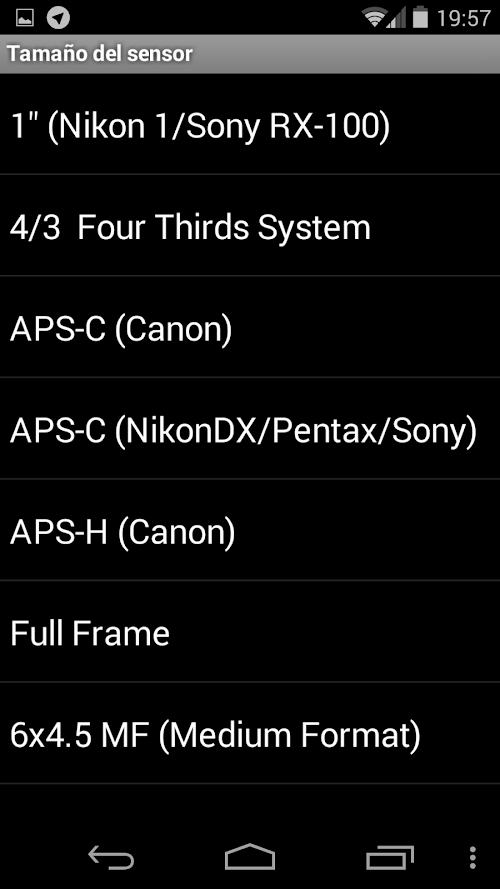 Fast DoF no usa interminables listas de modelos de cámara. En vez de ello, te permite escoger entre las categorías de sensor más habituales (desde móviles a gran formato).