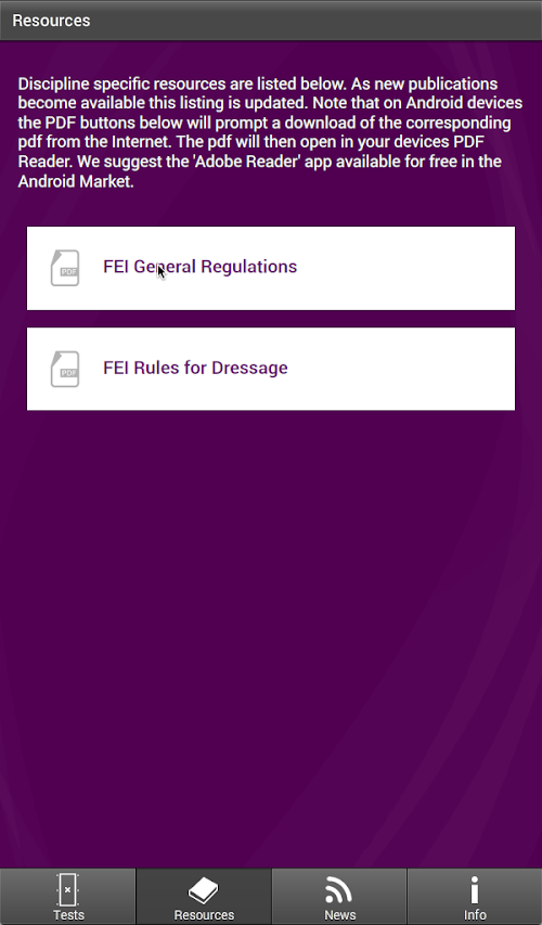 • Understand the rules for dressage events as PDFs of related rule books are provided for reference on topics such as movement definitions, competition rules, dress attire, judging and veterinary inspection