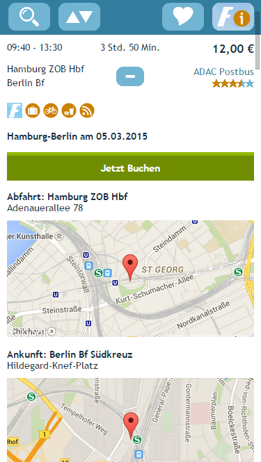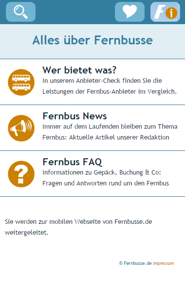 Wir wünschen Ihnen eine gute Reise! Fragen und Verbesserungsvorschläge gerne per E-Mail an: [email protected] Germany's great remote bus comparison for your pocket: With the free app of Fernbusse.de see long distance buses in Germany and throughout Europe at a glance. Compare not only German but also international suppliers and find the fastest and cheapest bus for your desired connection.