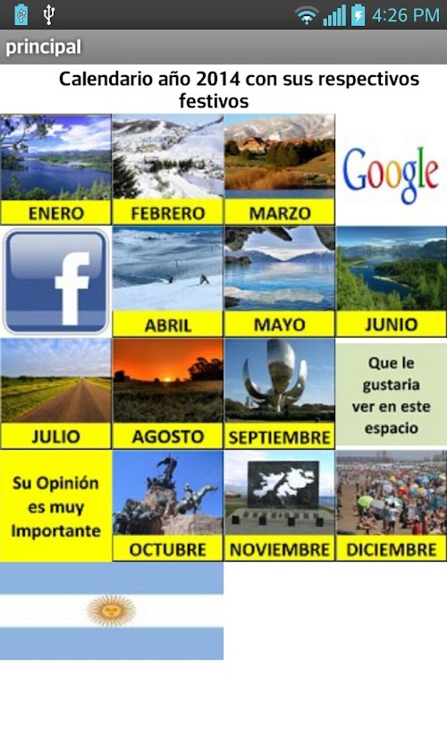 esta aplicación que espero sea de gran utilidad para todos los Ciudadanos Argentinos, pues en ella encontramos el calendario del año 2014 con sus respectivos festivos, NO necesita INTERNET, esta creada para todo tipo de usuarios. Ademas, es como si tuviéramos un calendario de billetera.I hope this application is very useful for all Argentine citizens, because in it we find the calendar of 2014 with their respective holidays, NO need INTERNET, this created for all kinds of users. Besides, it's like having a wallet calendar.