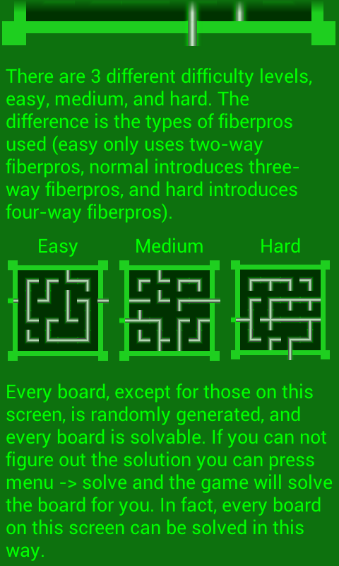There are 3 different difficulty levels easy, medium, and hard. Every board is randomly generated. If you cannot figure out the solution you can press menu-> solve and the game will solve the board for you. In fact, every board on this screen can be solved by this way.