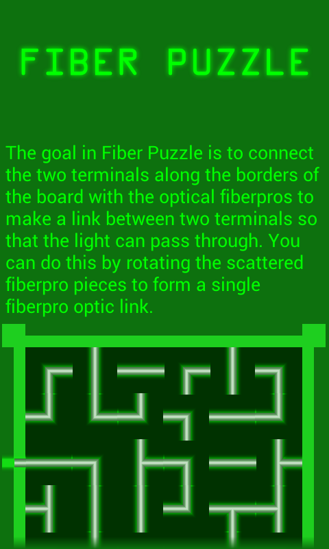 Fiber Puzzle is a free easy-to-use puzzle game with HD graphics .The goal in Fiber Puzzle is to connect the two terminals along the borders of the board with the optical fiber to make a link between two terminals so that the light can pass through. You can do this by rotating the scattered fiber pieces to form a sing fiber optic link.