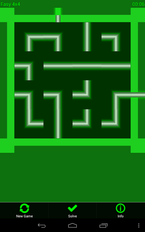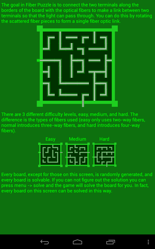 There are 3 different difficulty levels easy, medium, and hard. Every board is randomly generated. If you cannot figure out the solution you can press menu-> solve and the game will solve the board for you. In fact, every board on this screen can be solved by this way.
