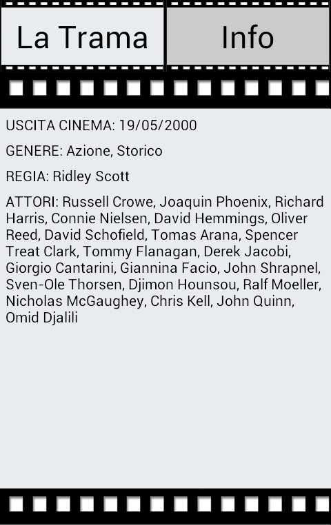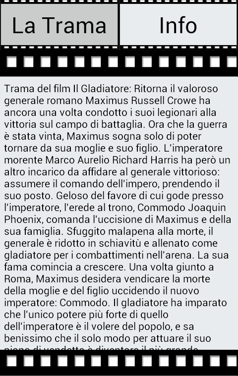 Ricerca per Regista: Vuoi conoscere tutti i film del tuo regista preferito? Inserisci il suo nome nella barra di ricerca e l'applicazione stampera' a video tutti i film da esso diretti, dandovi la possibilita' di consultarne la locandina, la trama, il Cast completo e tante altre utili informazioniFilm plots is the app that lets you read and search the threads of all the movies. The application has 4 main functions