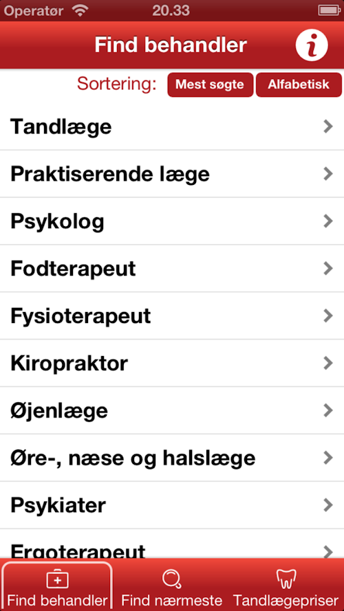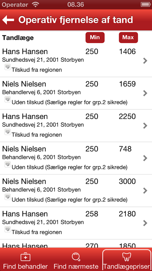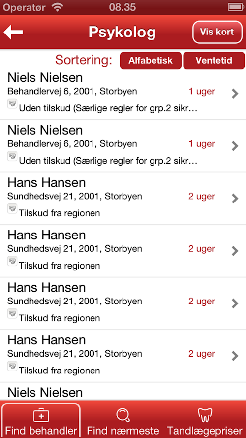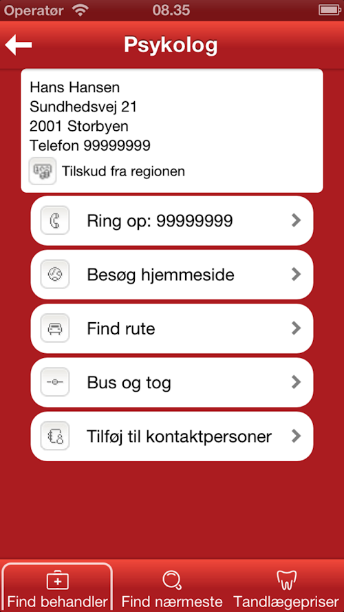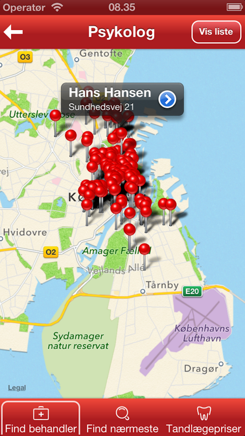 The app draws on information from sundhed.dk's 'Find treat', based on both data from the regions and data that each clinic are maintained. It is not possible to search for their own health information. This can be done by logging into sundhed.dk.