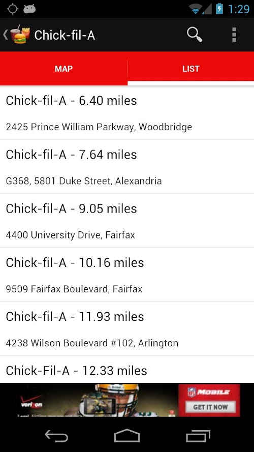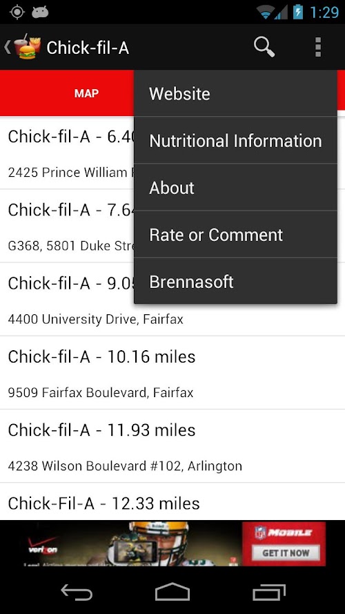 Once you select a restaurant the nearest locations will show up on the map. From here you can choose a location and navigation will start or you can view the menu and nutritional information.