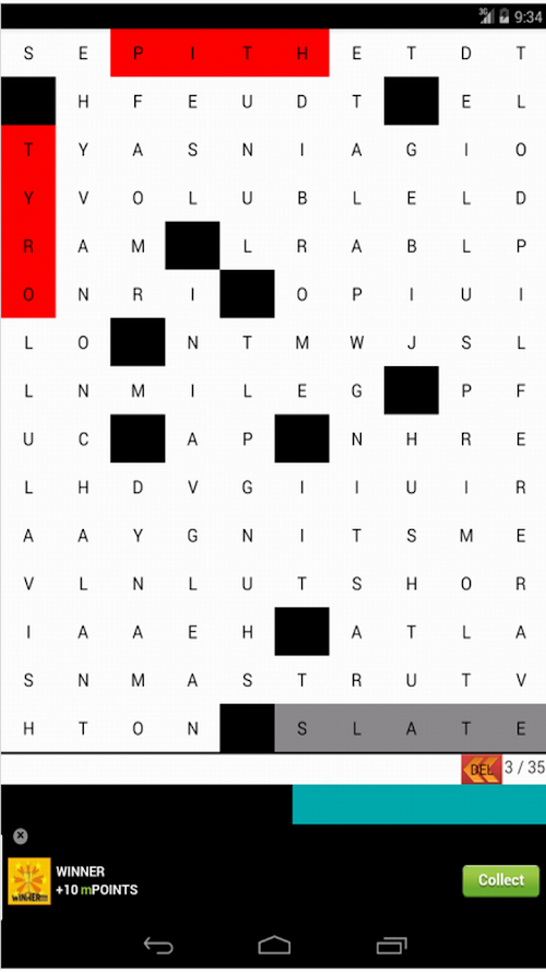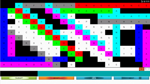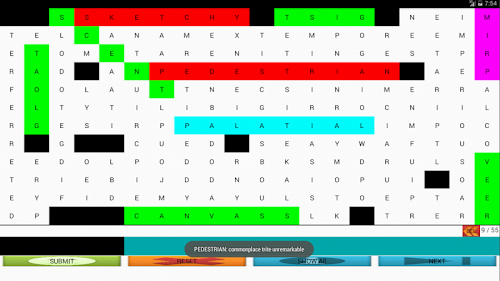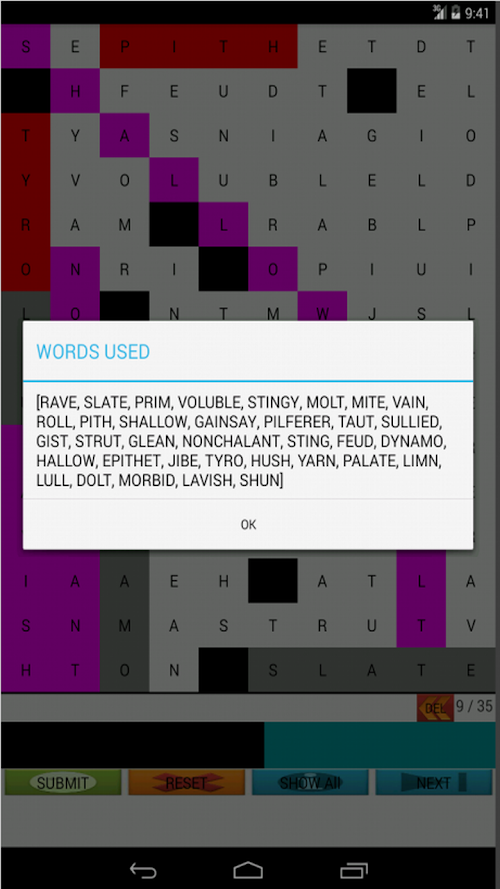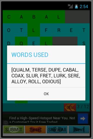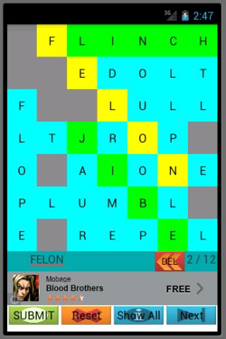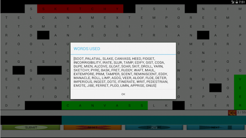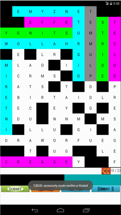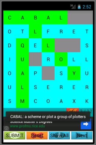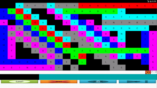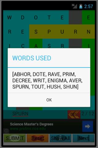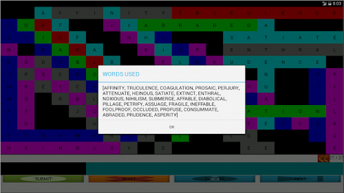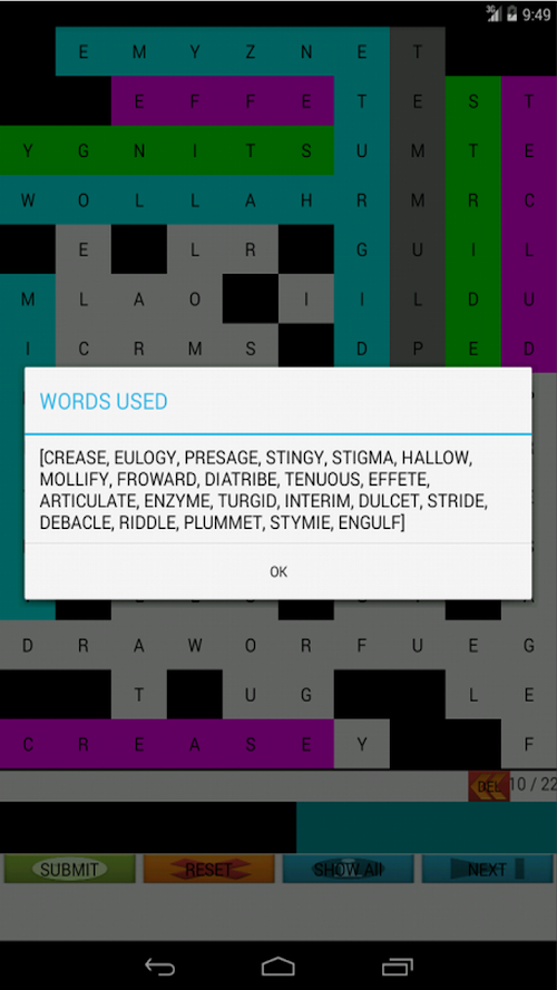 In this game, various words are arranged randomly and are "hidden" in a grid going in many directions, and your objective is find those words. When you guess a word successfully, the app tells you the meaning of the word and you move on the next. It also keeps track of your score in terms how many words you were able to discover.