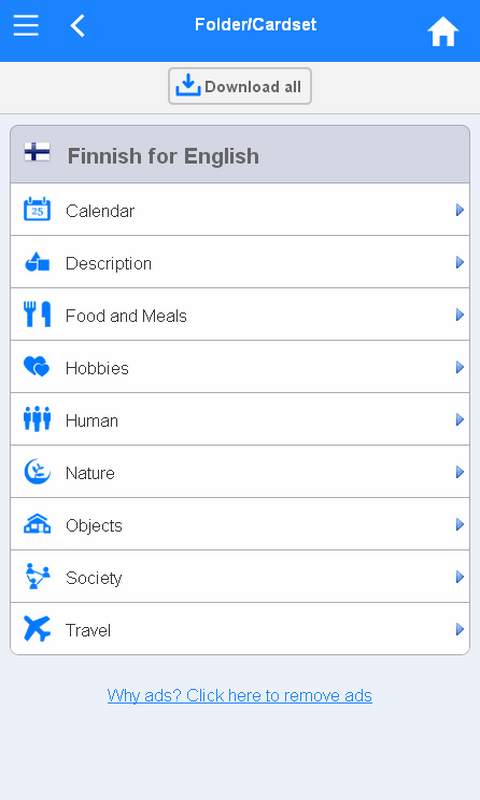 Finnish flashcards app includes 4000+ premade Finnish flashcards which cover the most used Finnish words from 9 categories: