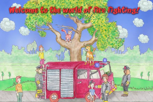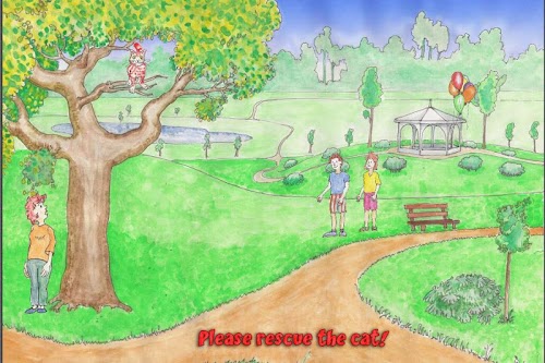 "Oh dear! A cat has climbed on a tree and is afraid of climbing down again! Call the fire brigade and rescue the poor animal with help from the firefighter!"
