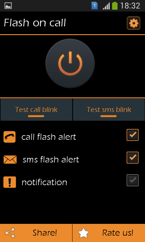 Flashing/Blinking Camera flash light on incoming calls, Text Messages and Social Notifications. Flash on call helps you for finding your phone when it put misplace or your cell is in silent/vibrate mode.It will also flashing when you have Social Notifications like WhatsApp, Facebook, Goggle talk. You can use this application also as Flash Light, Torch Light, LED party Light, Strobe Light.