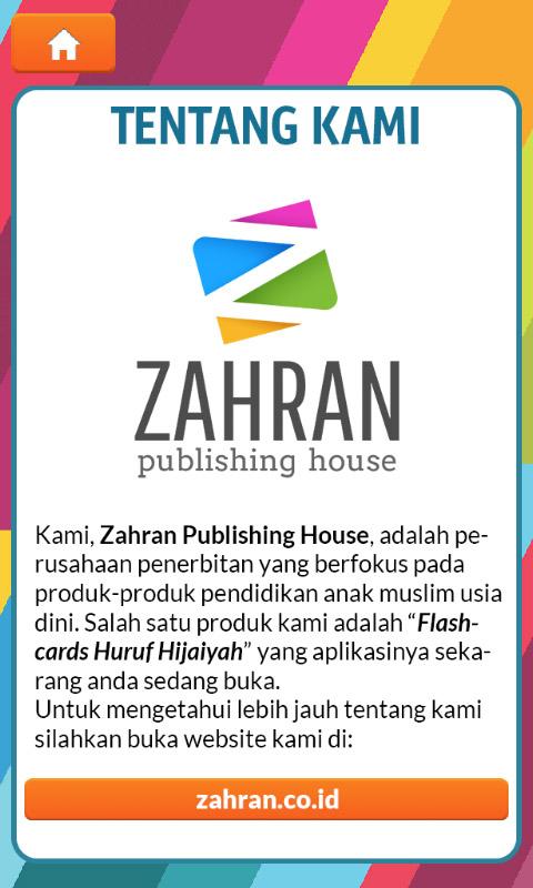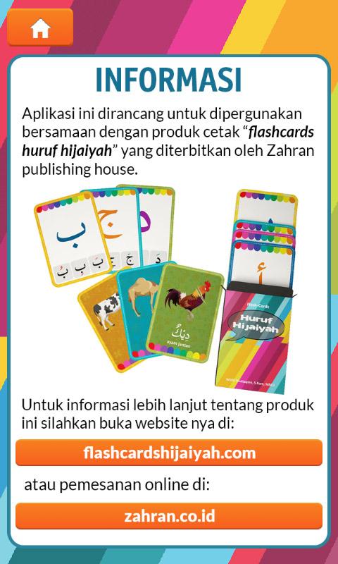 Aplikasi ini dirancang untuk dipergunakan bersamaan dengan produk cetak “Flashcards Huruf Hijaiyah” yang diterbitkan oleh Zahran publishing house.