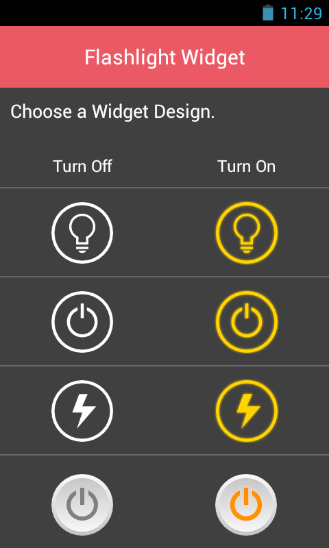 This version of Flashlight Widget Android App comes with one universal variant which will work on all the Android devices.
