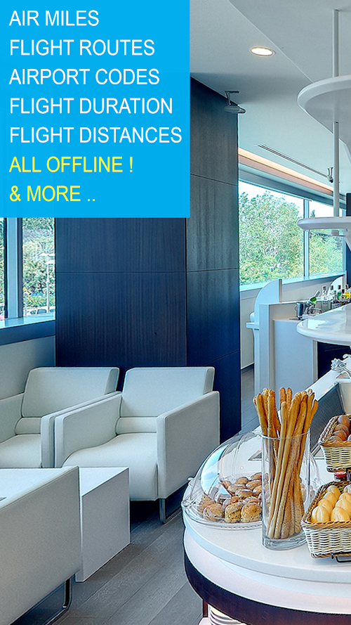 Flight Explorer (offline): helps you calculate Flight Times, Distances, Mileages, Routes and lookup airport codes from around the world.