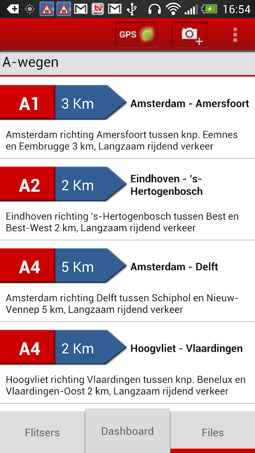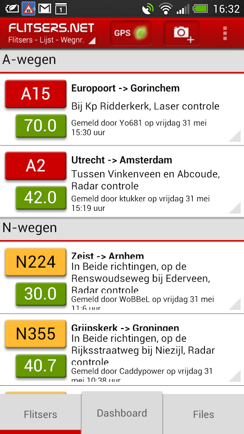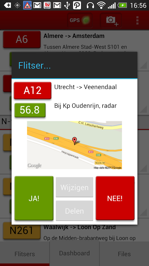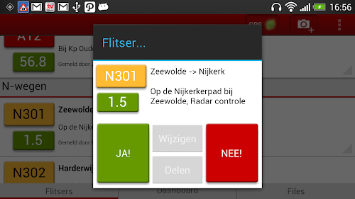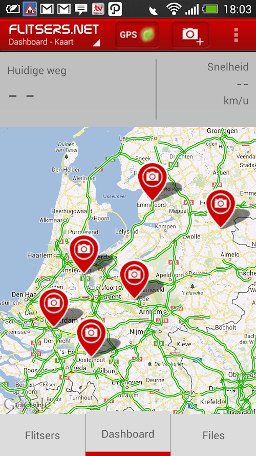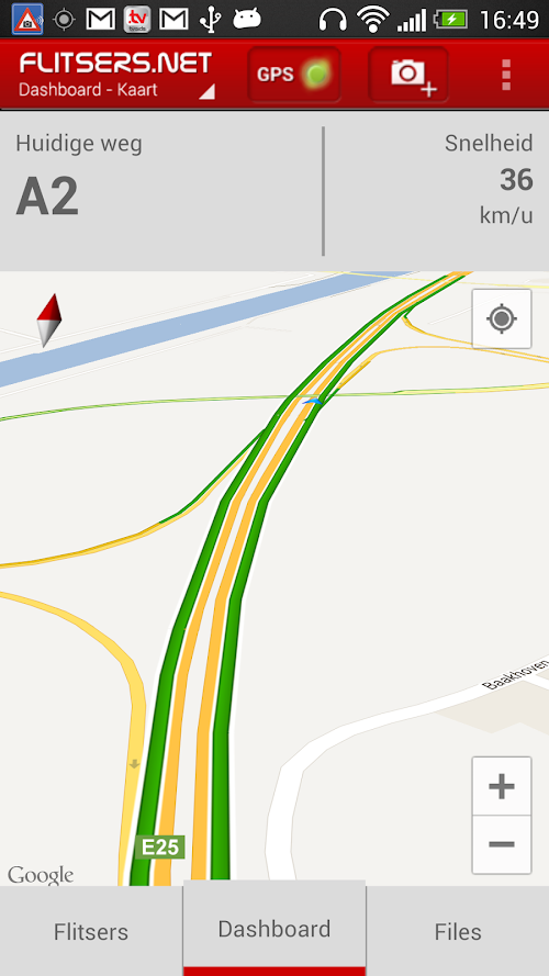 + Dashboard with speedometer, road number and hectometersign. The app knows exactly where you are and also whether you are approaching a flash control.