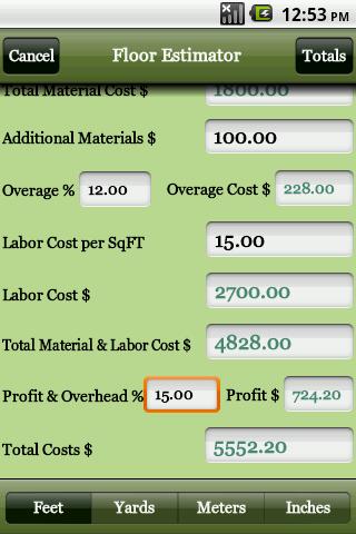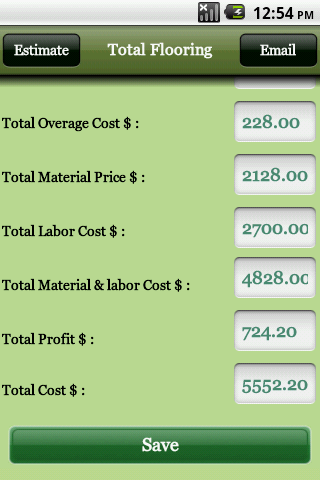 Flooring Estimator can create a quick and easy way to bid or estimate on a job site. This App can be used for professional estimating or home use. Floor Bid is effective and accurate for cost, material needed profit and overhead and much more.