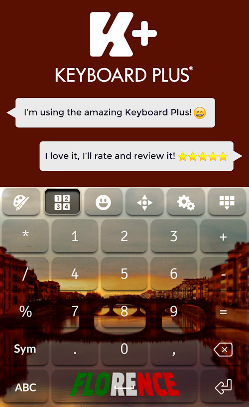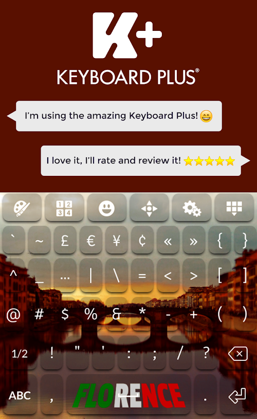 Don't miss the chance and download for free this Florence Keyboard theme and explore the beautiful city at a glance directly from your keyboard. Simple as it sounds, right? Enjoy our keyboard theme and don't forget to give us a rate! You can also check out our other free themes from the store. Come to Florence and forget about your problems!