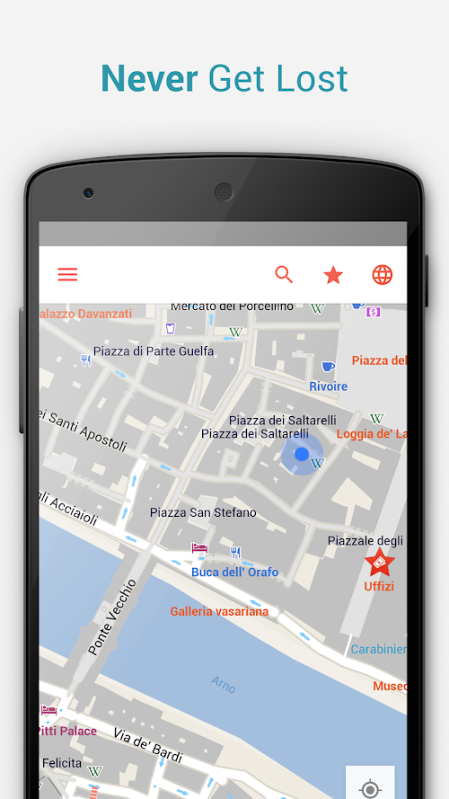 Never get lost and keep your orientation. Identify your location offline on the map, even without an internet connection. See what is around you on a map that shows a zoom able level of detail with many location related information. Find streets, attractions, restaurants, hotels, local nightlife and other interesting places – and get guided in the walking direction of places you want to see.
