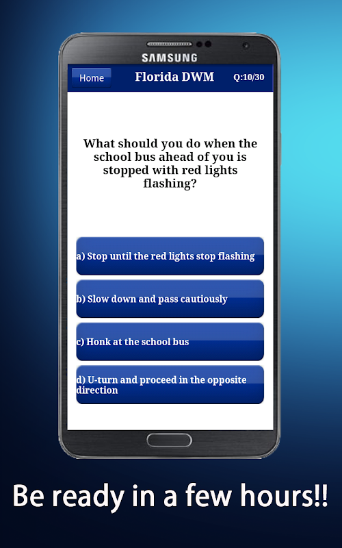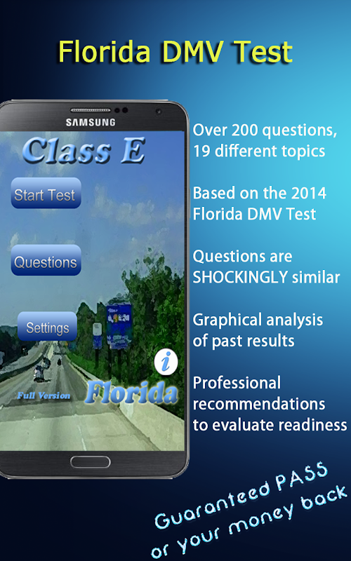 Do you want to spend only a few hours studying and still pass your Florida DMV Test on the first try? This app is professionally designed specifically for the State of Florida. All the practice questions are based on the latest Florida DMV Driver's Manual. 3 test modes are available to suite your individual learning style. Don't waste time and money writing the Florida Class E Test again and again. Study for your Florida DMV Test right now on your Android Phones and Tablets!