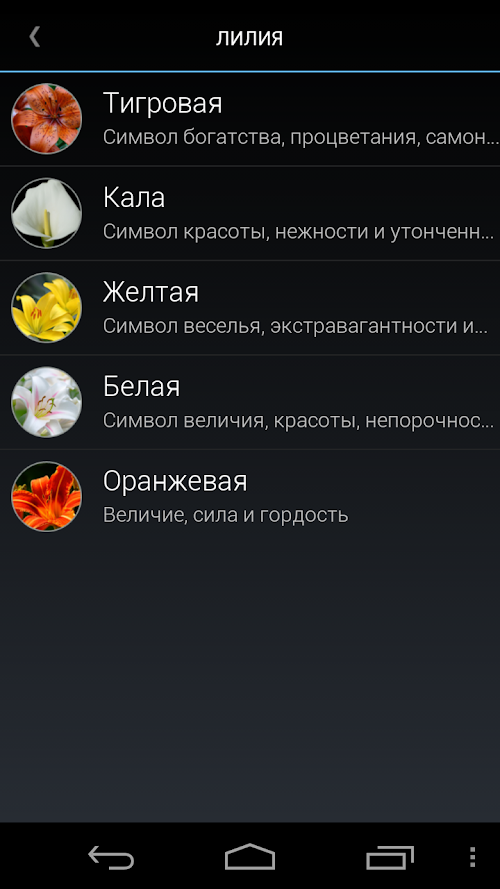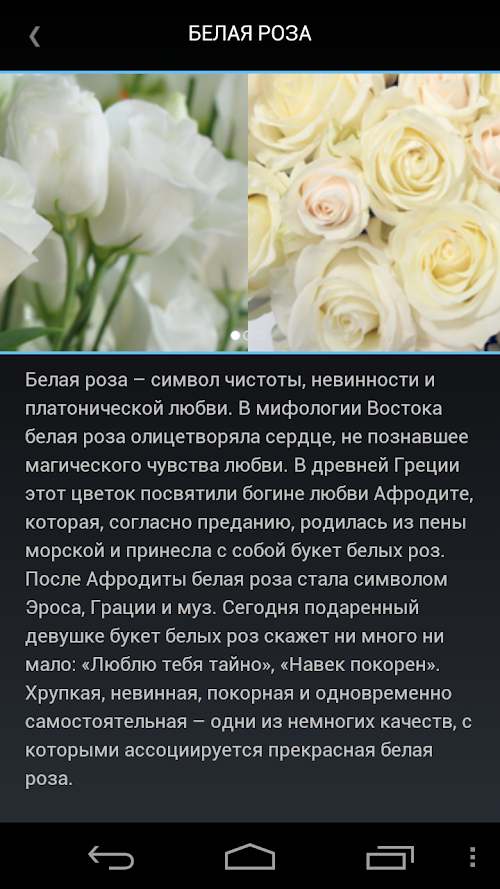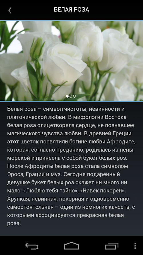Цветы широко использовались для выражения чувств, которые по той или другой причине не могли быть высказаны или написаны. В некоторых странах цветы представляли собой сложный язык. Приложение содержит описание наиболее популярных цветов. Оно станет полезным всем желающим узнать что же значит тот или иной цветок.