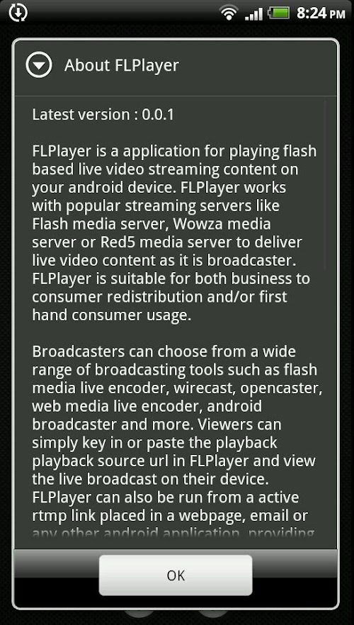Broadcasters can choose from a wide range of broadcasting tools such as flash media live encoder, wirecast, opencaster, web media live encoder, android broadcaster and more. Viewers can simply key in or paste the playback playback source url in FLPlayer and view the live broadcast on their device. FLPlayer can also be run from a active rtmp link placed in a webpage, email or any other android application, providing unobtrusive playback of live video on your device.