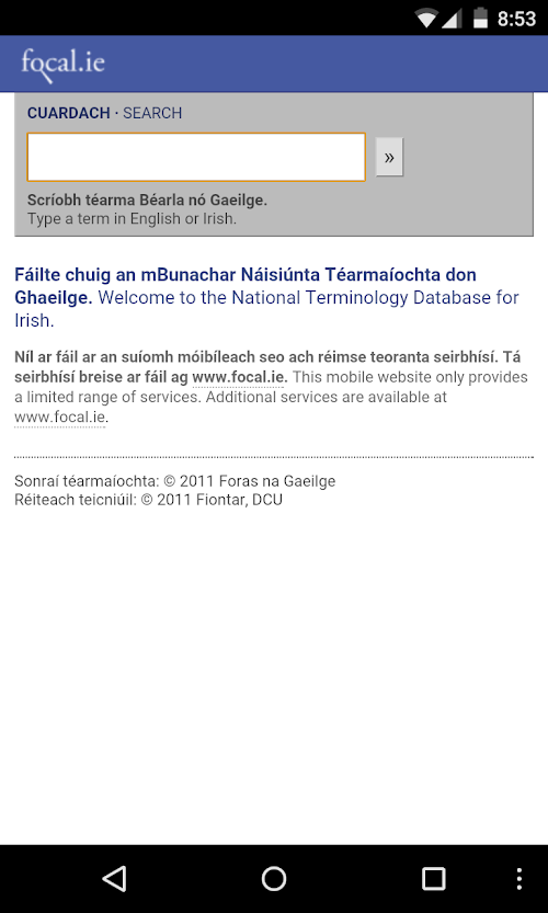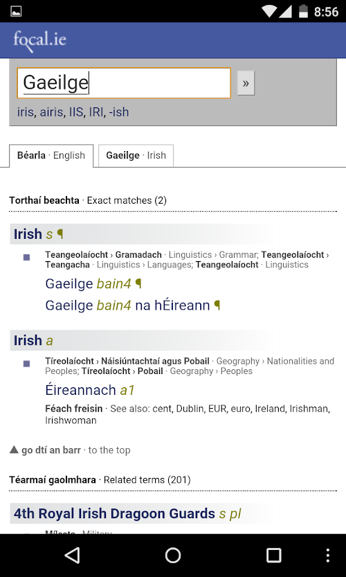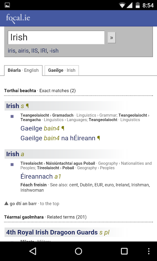 This app is an accurate translator for translating Irish into Englsih. This apps rights belong to the National Terminology Database for Irish, developed by Fiontar, DCU in collaboration with An Coiste Téarmaíochta, Foras na Gaeilge.