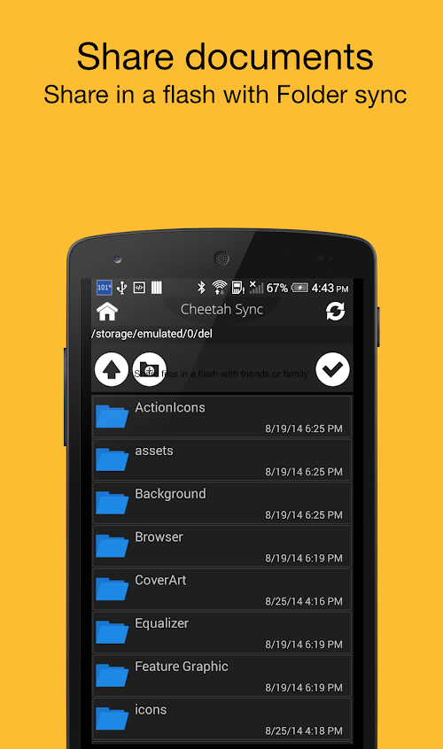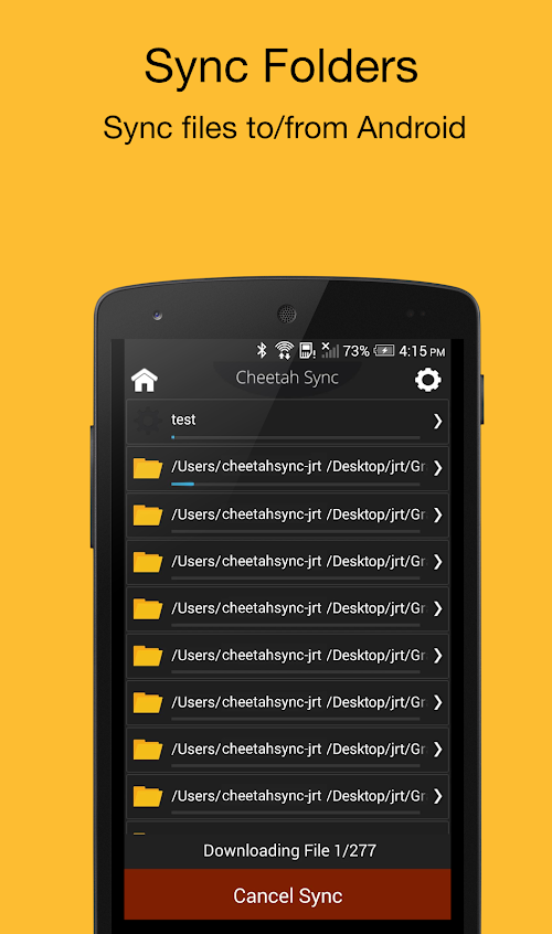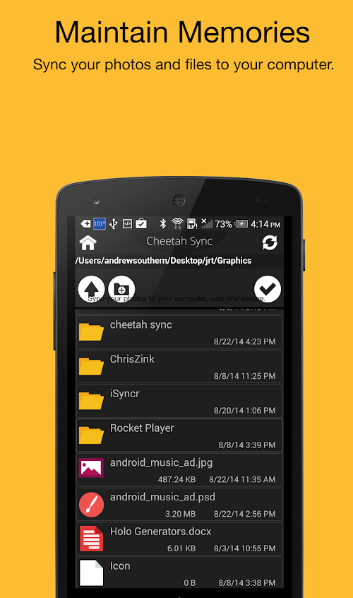 Folder sync (formerly: Cheetah Sync) is the no cloud solution for keeping files on your computer and Android device in sync. You can now have your pictures, important documents, music and videos from your computer on the go! Just select a folder on your computer, a folder on your Android device, and let Folder Sync keep the files in sync!