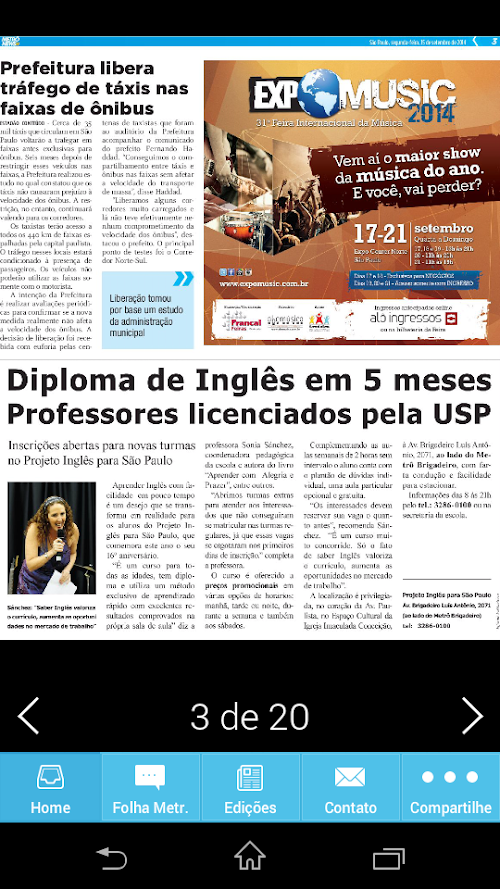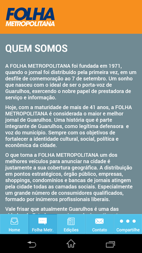 Vale frisar que atualmente Guarulhos é uma das cidades do Estado que mais recebe investimento na indústria, estabelecimentos comerciais e prestação de serviço, gerando o segundo maior mercado potencial de consumo do Estado de São Paulo.The application of the newspaper SHEET METROPOLITAN keeps well informed about everything that happens in Guarulhos most important player, the second largest city in the state of São Paulo. Through the app, the reader will have the convenience of being able to access that day's edition anywhere: at home, on the bus, at school or at work.