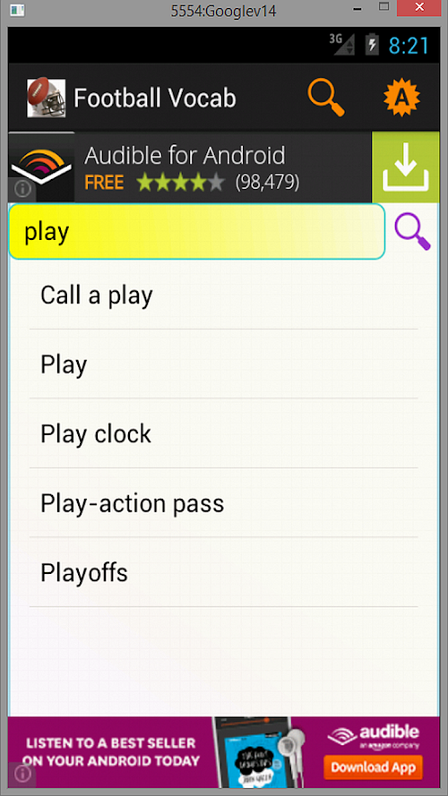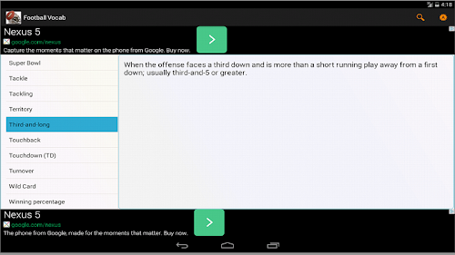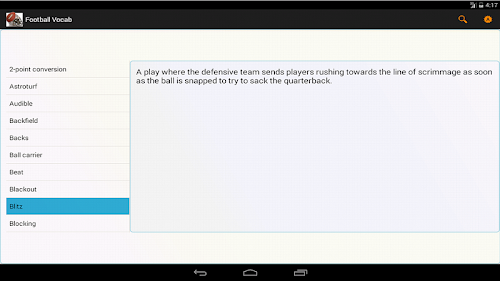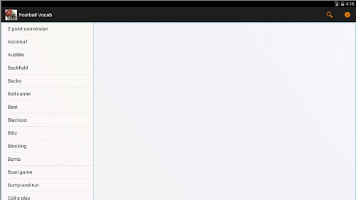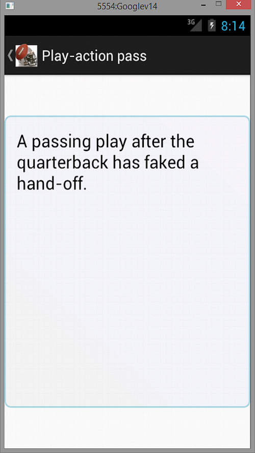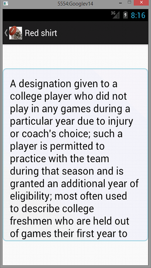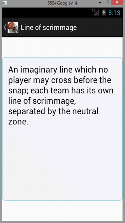 Do you feel lost in the myriad of football terms when your buddies or significant other discusses the sport ? What does a Punt really mean ? What is a drop kick ? What is a Lateral Pass ? In this app, we have tried to demystify the world of American Football by giving clear concise definitions of each term in ordinary language. This app is meant for the general folks, though expert football fans might pick up a new term or two.