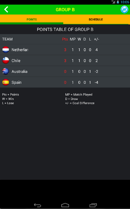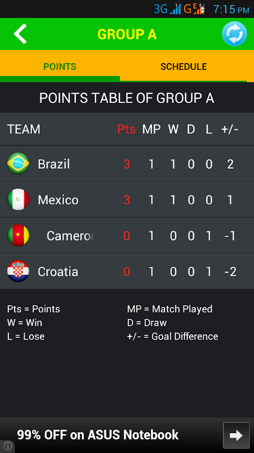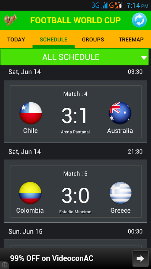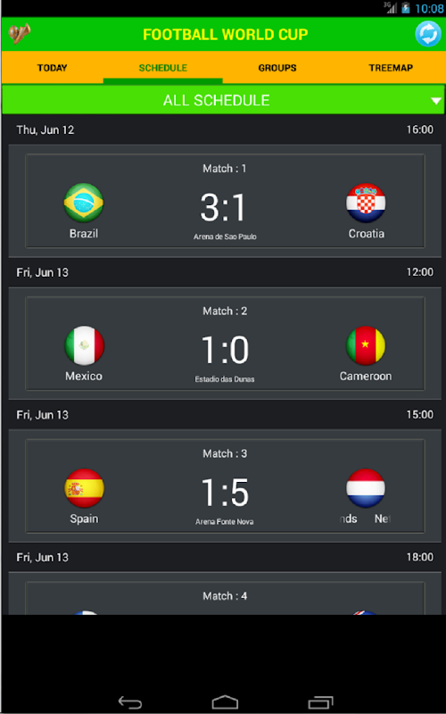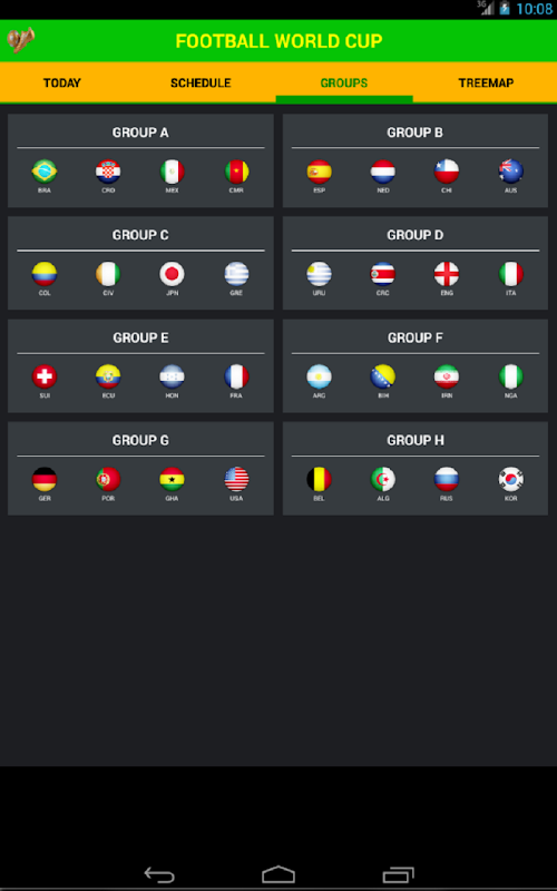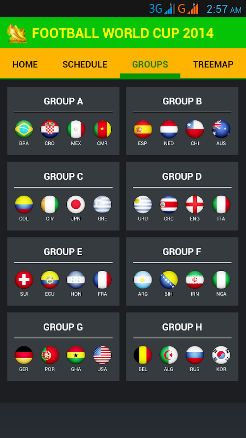Choose any specific country you are following and get details of all football match fixtures of that team. As you know, 2014 Brazil Football World Cup consists of 32 teams and they are divided into 8 groups. Below is group information which you can also access from app:
