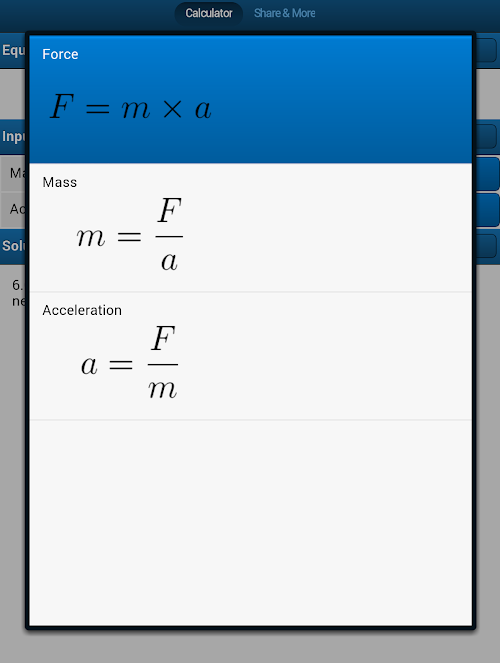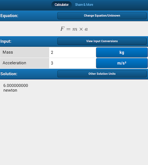Physics calculator to solve for any variable in the force equation. Unknown and formula variables includes force, mass and acceleration. The inputs are converted to standard SI units before the calculations are performed. The solution is given in SI units and provides unit conversions for other common units.
