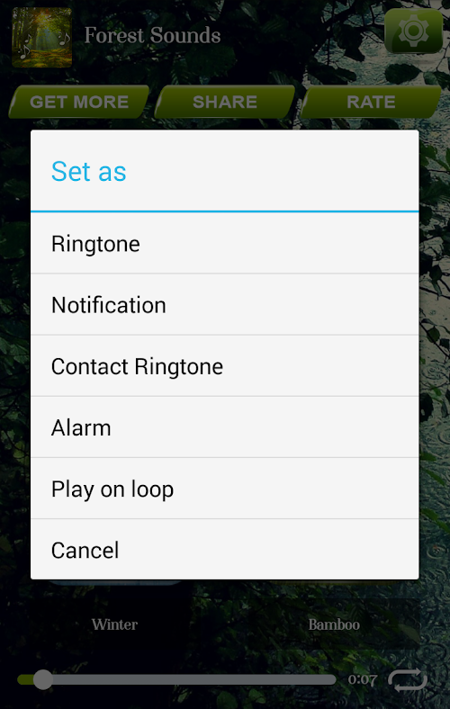 -New screen to set the sounds as ringtone, notification, contact ringtone or alarm (press and hold play to enter the screen);
